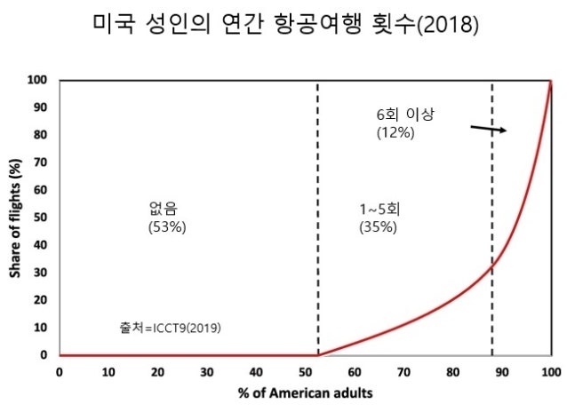최근 스웨덴과 독일 연구진이 국제학술지 '세계환경변화' 11월호에 항공 부문의 탄소 불평등 현황을 구체적으로 추정한 연구 결과를 발표했다. 이에 따르면 2018년을 기준으로 전 세계 인구의 1%에 해당하는 ‘슈퍼여행객'이 배출하는 탄소량이 항공 부문 전체 배출량 10억톤의 절반을 차지했다. 그해 국내선을 포함한 전체 항공기 이용객은 전 세계 인구의 11%, 국제선 항공기 이용객은 세계 인구의 2~4%에 불과하다. 고소득 국가인 한국의 경우 한 해 국제선 이용객 수가 3천만명에 이를 정도로 항공여행이 보편화돼 있지만 세계 전체로 보면 아직도 항공기는 아주 소수의 이동수단이다.